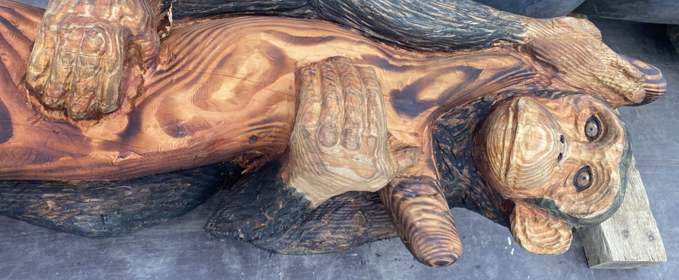 Forest Craft made the Monkey sculpture from a single trunk of a tree grown in Douglas Fir. The Lion and Elephant were made from an enormous Scots Pine tree which was felled for safety reasons. The Elephant was made from three large pieces of wood that were joined together and carved. Forest Craft also crafted a Pelican footprint, which was used to create prints within the concrete pads to promote imaginary play by bringing the play area to life.